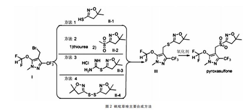 從有關(guān)文獻(xiàn)報(bào)道,砜吡草唑合成方法主要有4種(見(jiàn)圖2)。
