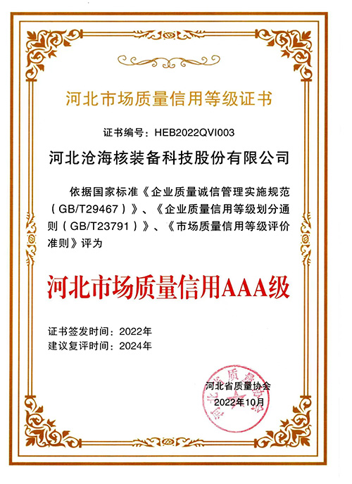 河北滄海河北市場質量信用等級證書