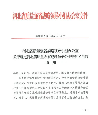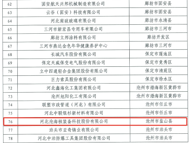 近日,河北省質(zhì)量強省戰(zhàn)略領(lǐng)導(dǎo)小組發(fā)布通知,河北滄海核裝備科技股份有限公司入選河北省質(zhì)量強省建設(shè)領(lǐng)軍企業(yè)培育名單,這也是滄海核裝獲得政府質(zhì)量獎后獲得的又一質(zhì)量建設(shè)領(lǐng)域的榮譽資質(zhì)。
